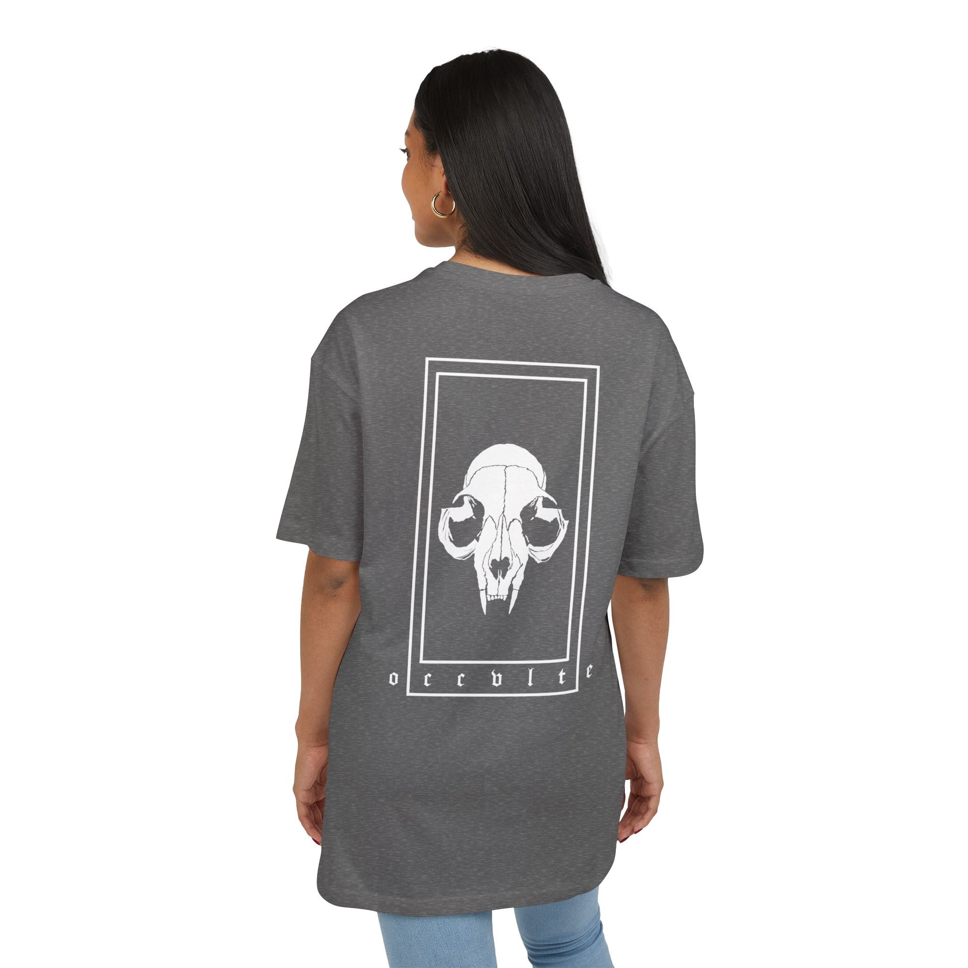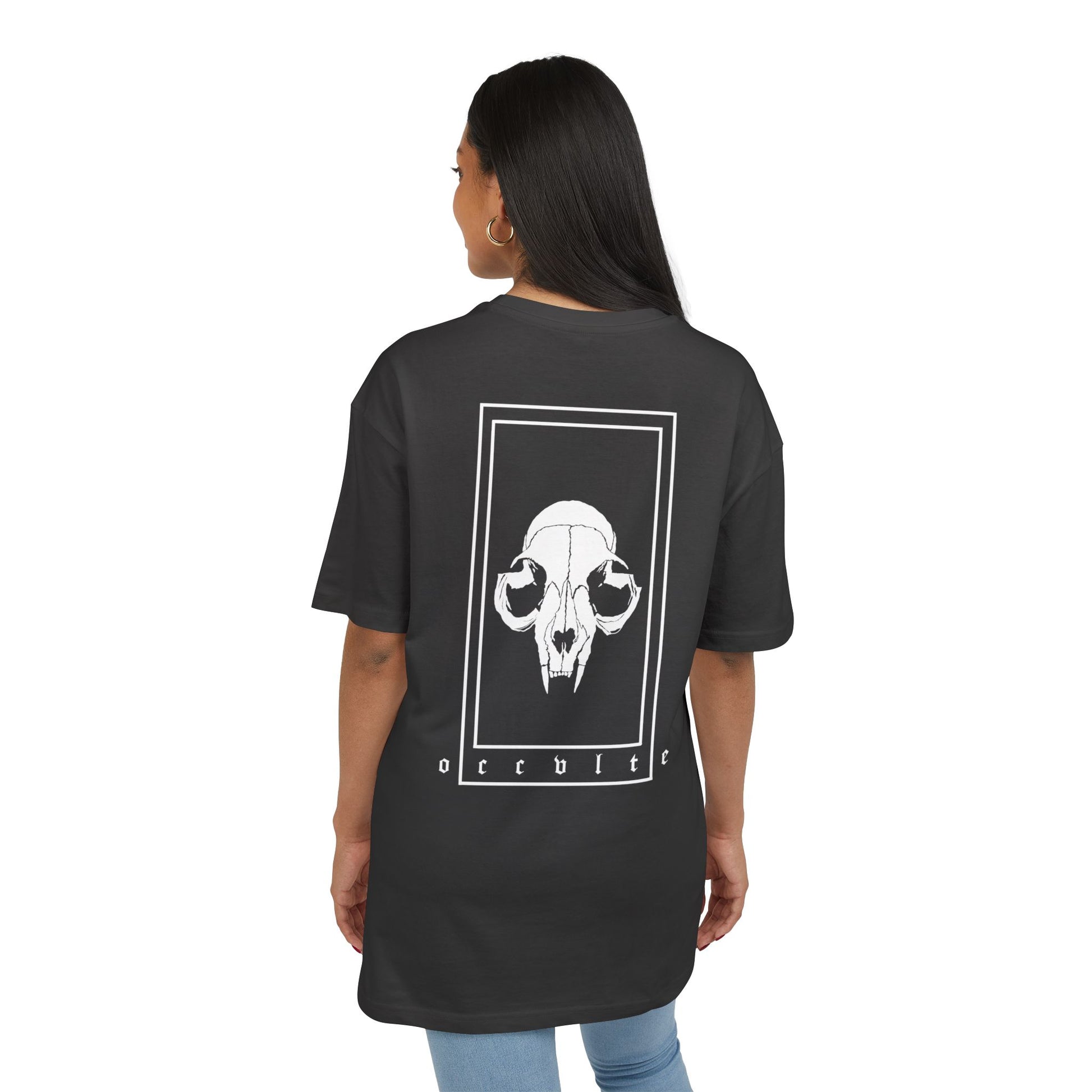 The Cat oversized t-shirt carries the essence of OCCVLTE: the beautifully feral. Featuring original artwork by Diane Clénin, founder of OCCVLTE, this hand-drawn cat skull is a tribute to the liminal spaces cats have always inhabited — guardians of thresholds, companions of witches, and sovereign wanderers between worlds.